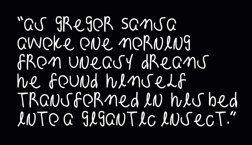 Kafka uses a square grid to express the separation. Gregor is a more emotional typeface. Handwritten and crumpled forms indicate Gregor's anxious feeling.